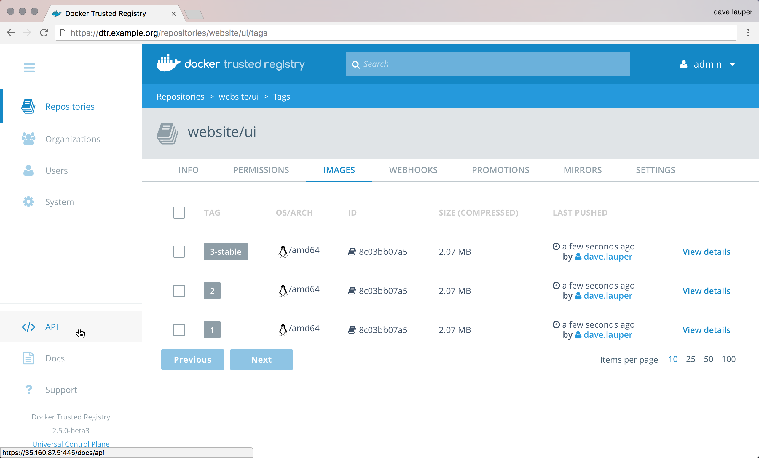 In the DTR web UI, click the top-right menu, and choose API docs.