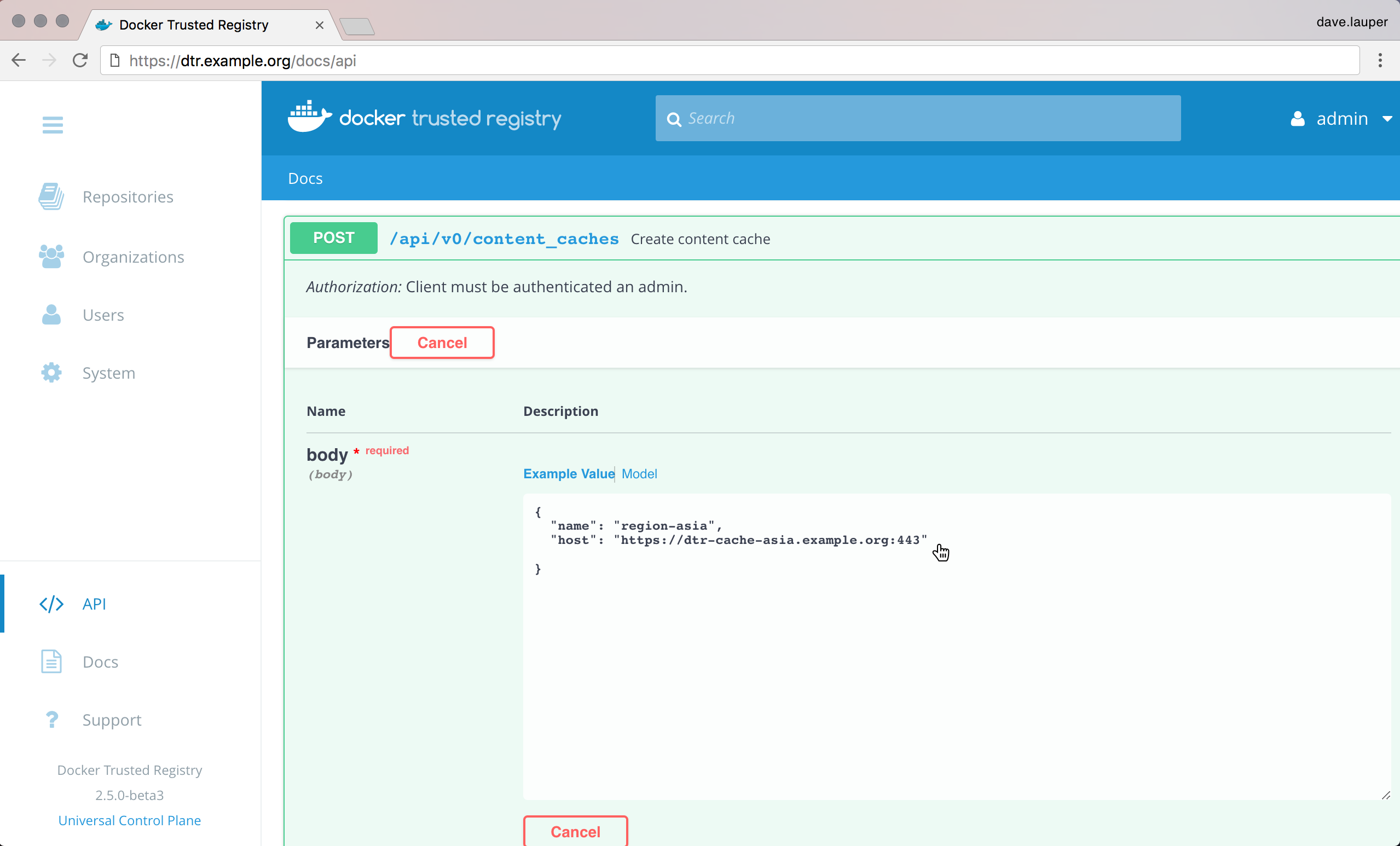 In the DTR web UI, navigate to your Account, click the Settings tab, and change the Content Cache settings to use the cache you deployed.
