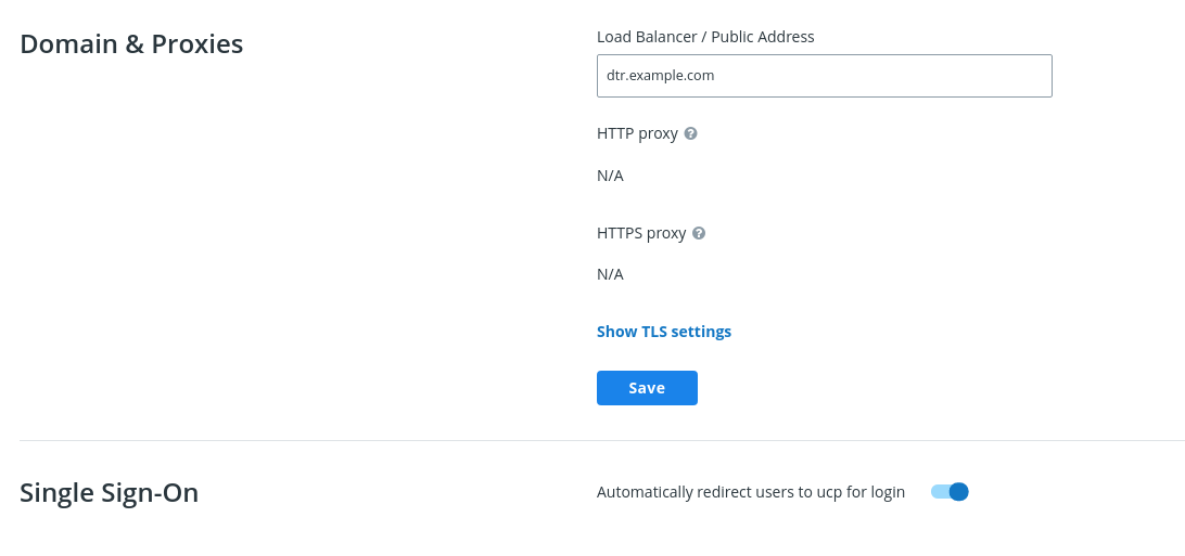 This makes it so that when you access DTR’s web user interface, you are redirected to the UCP login page for authentication. Upon successfully logging in, you are then redirected to your specified DTR external URL during installation.