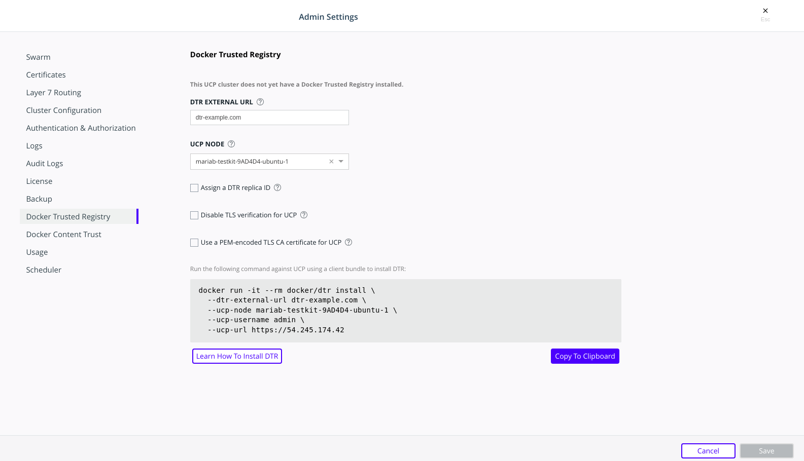 DTR requires Docker Universal Control Panel (UCP) to run. If UCP is not yet installed, refer to install UCP for production.