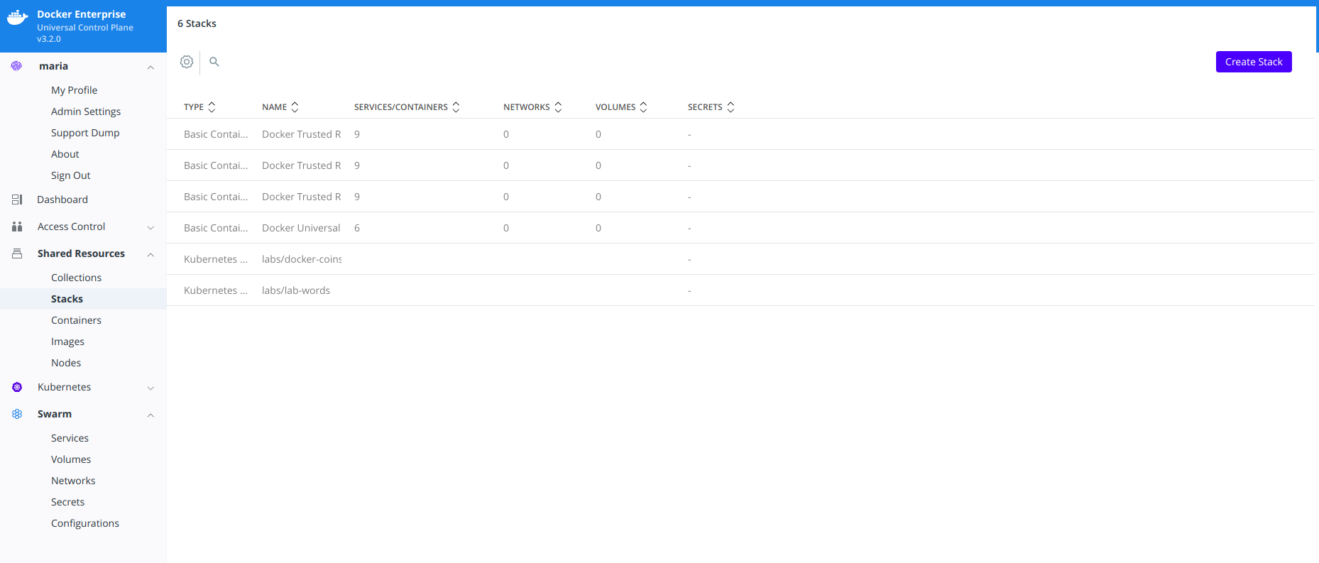 In your browser, navigate to UCP’s web interface. Select Shared Resources > Stacks. All replicas should be displayed.