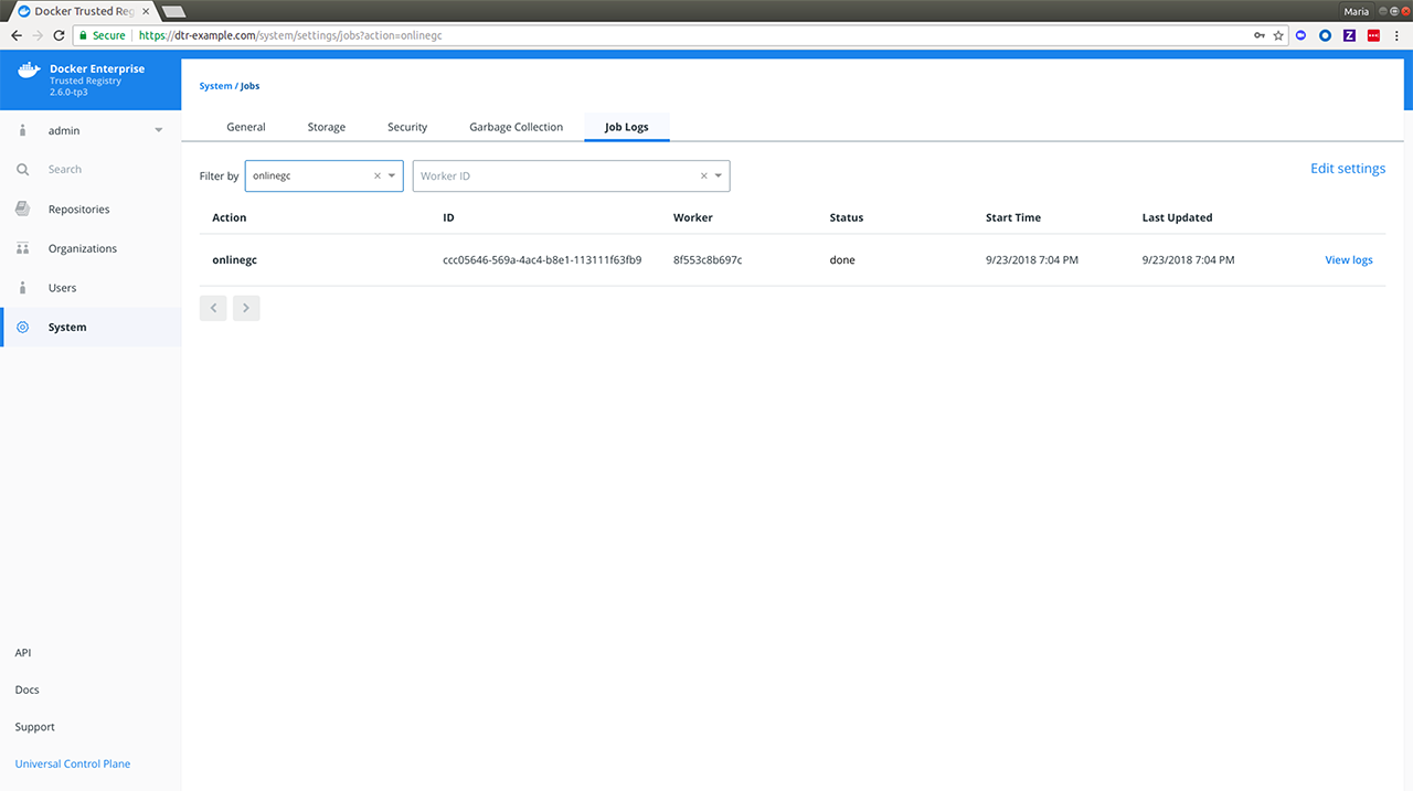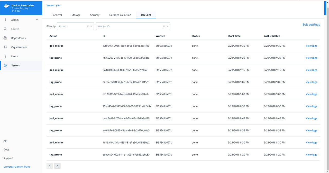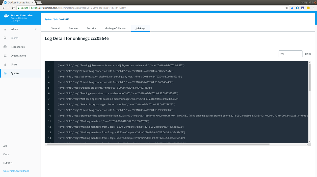 As of DTR 2.2, admins were able to view and audit jobs within DTR using the API. DTR 2.6 enhances those capabilities by adding a Job Logs tab under System settings on the user interface. The tab displays a sortable and paginated list of jobs along with links to associated job logs.