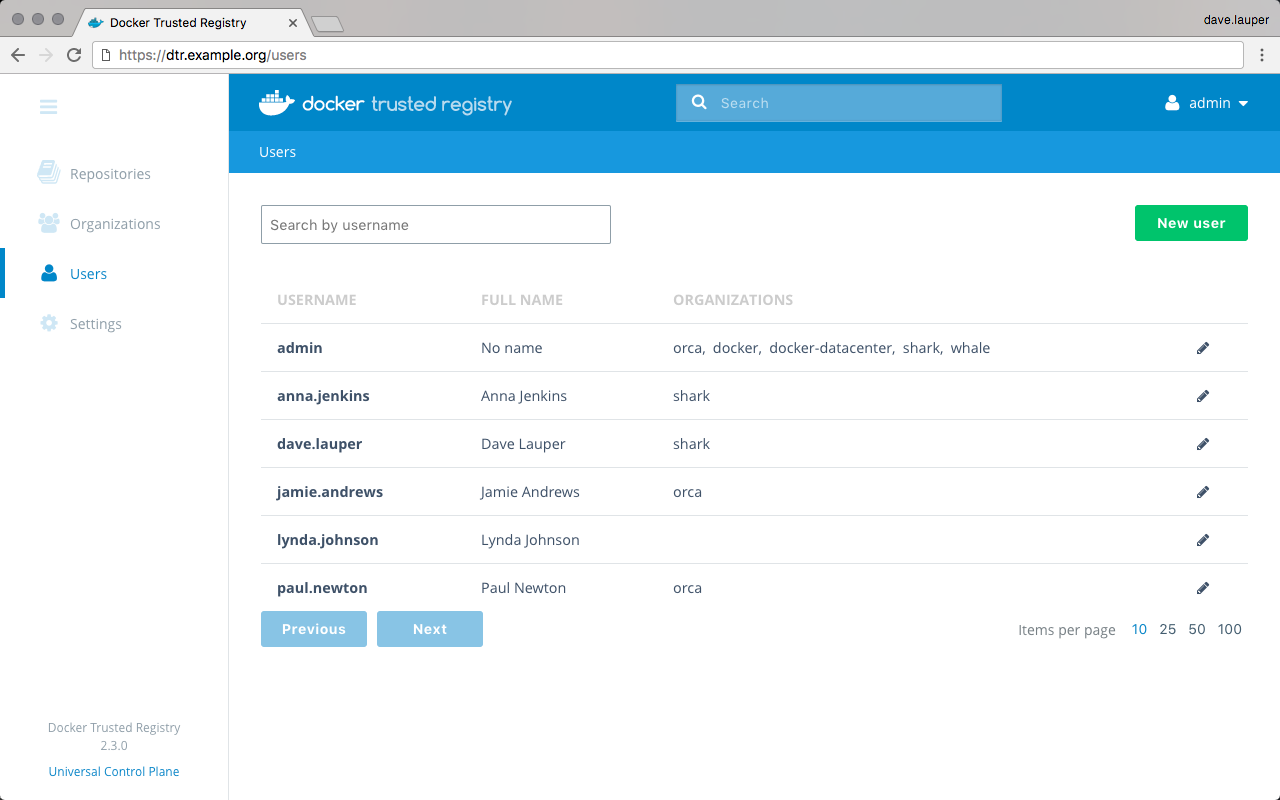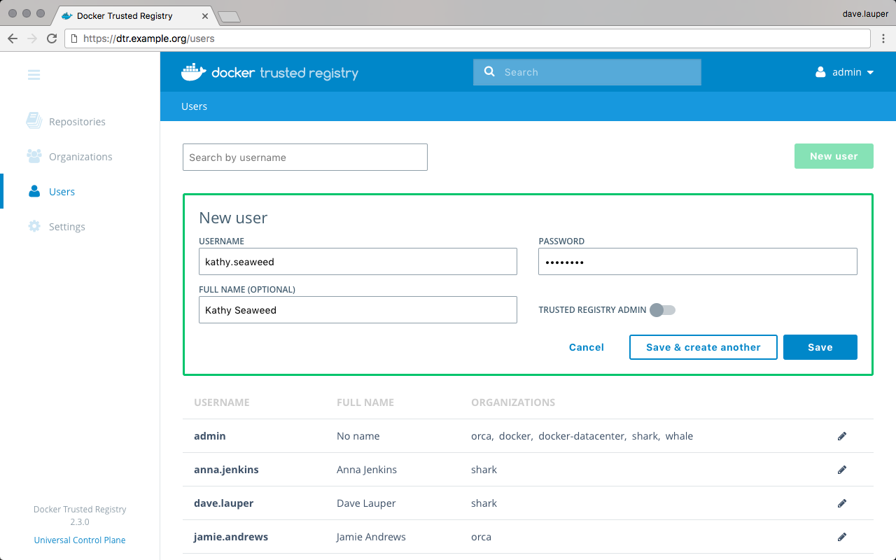 Users are shared across UCP and DTR. When you create a new user in Docker Universal Control Plane, that user becomes available in DTR and vice versa.