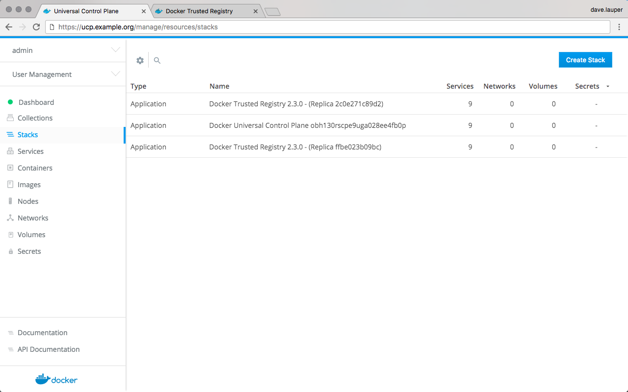 In your browser, log in to Docker Universal Control Plane (UCP), and navigate to the Stacks page. If you have DTR set up for high-availability, then all the DTR replicas are displayed.