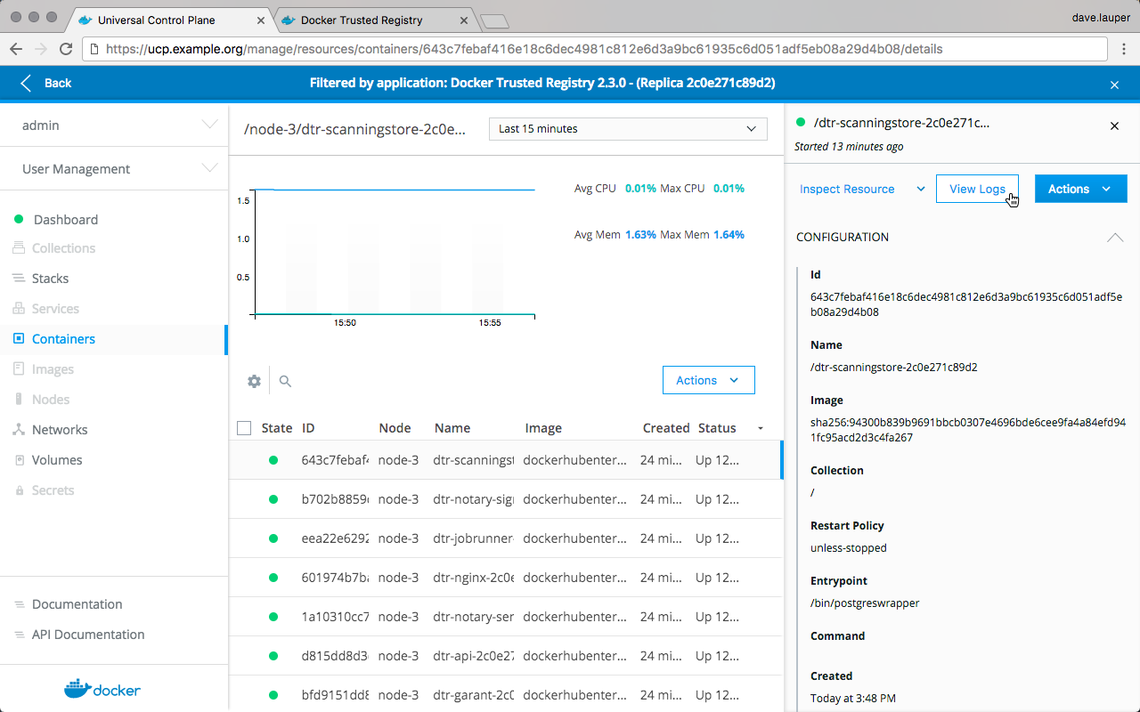Now you can drill into each DTR container to see its logs and find the root cause of the problem.