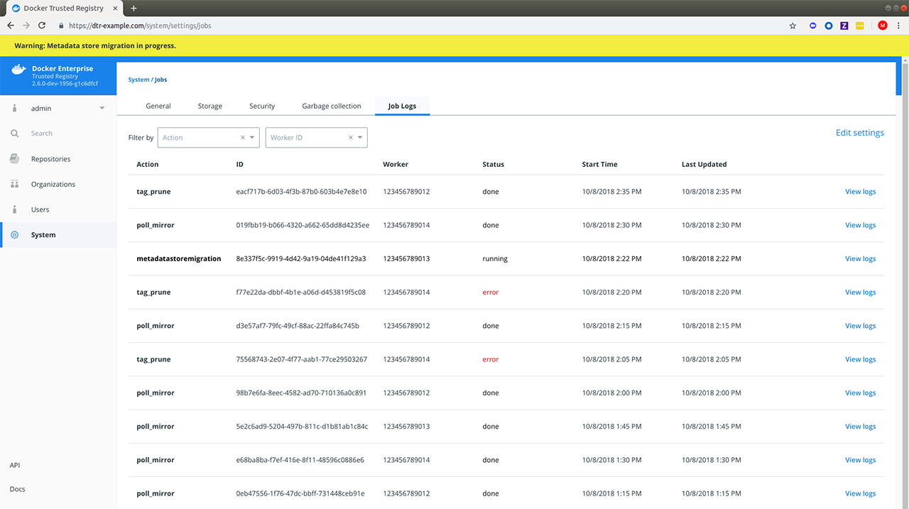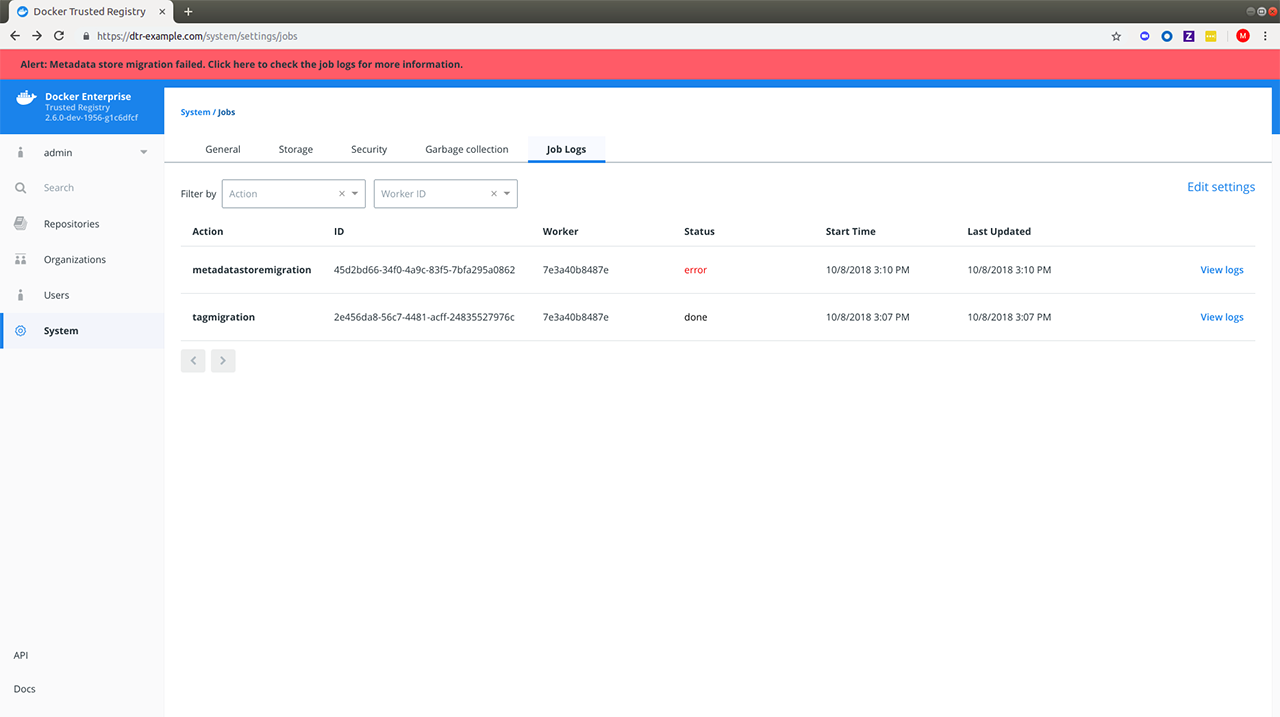 When upgrading from 2.5 to 2.6, the system will run a metadatastoremigration job following a successful upgrade. This involves migrating the blob links for your images, which is necessary for online garbage collection. With 2.6, you can log into the DTR web interface and navigate to System > Job Logs to check the status of the metadatastoremigration job. Refer to Audit Jobs via the Web Interface for more details.