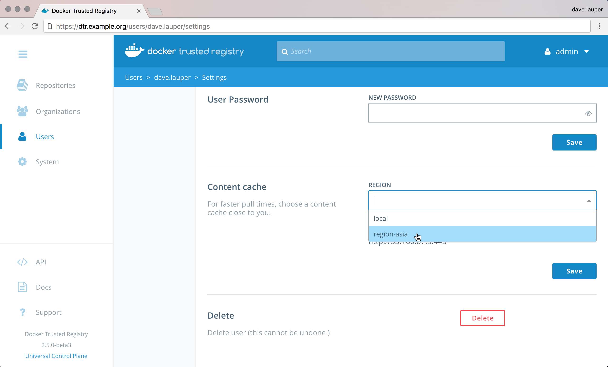 In the DTR web UI, navigate to your Account, and check the Content Cache options.