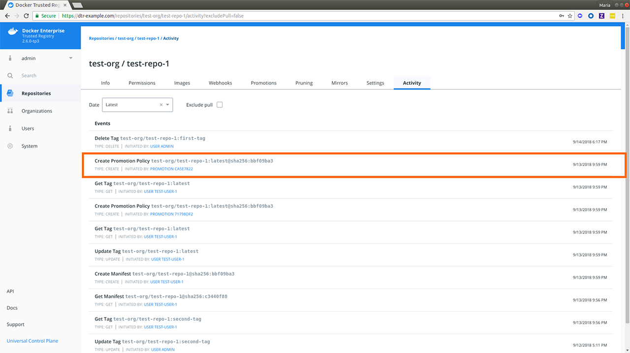 As of DTR 2.3, admins were able to view a list of DTR events using the API. DTR 2.6 enhances that feature by showing a permission-based events list for each repository page on the web interface. To view the list of events within a repository, do the following: