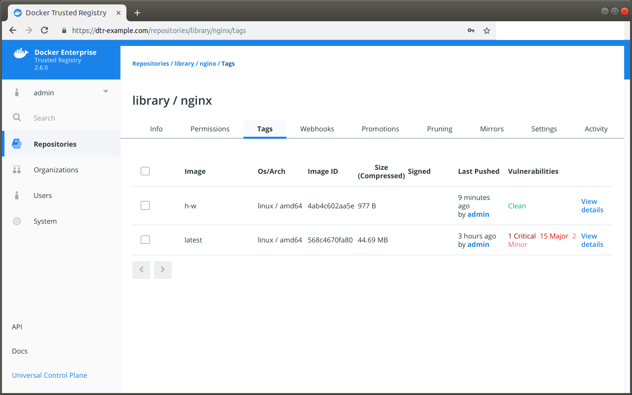 Once dismissed, the vulnerability is hidden system-wide and will no longer be reported as a vulnerability on affected images with the same layer IDs or digests. In addition, DTR will not reevaluate the promotion policies that have been set up for the repository.