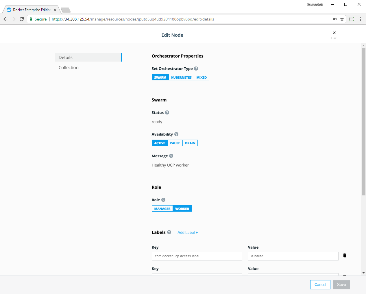 In the UCP web UI, browse to the Nodes page and select the node. In the details pane, click the Configure to open the Edit Node page.