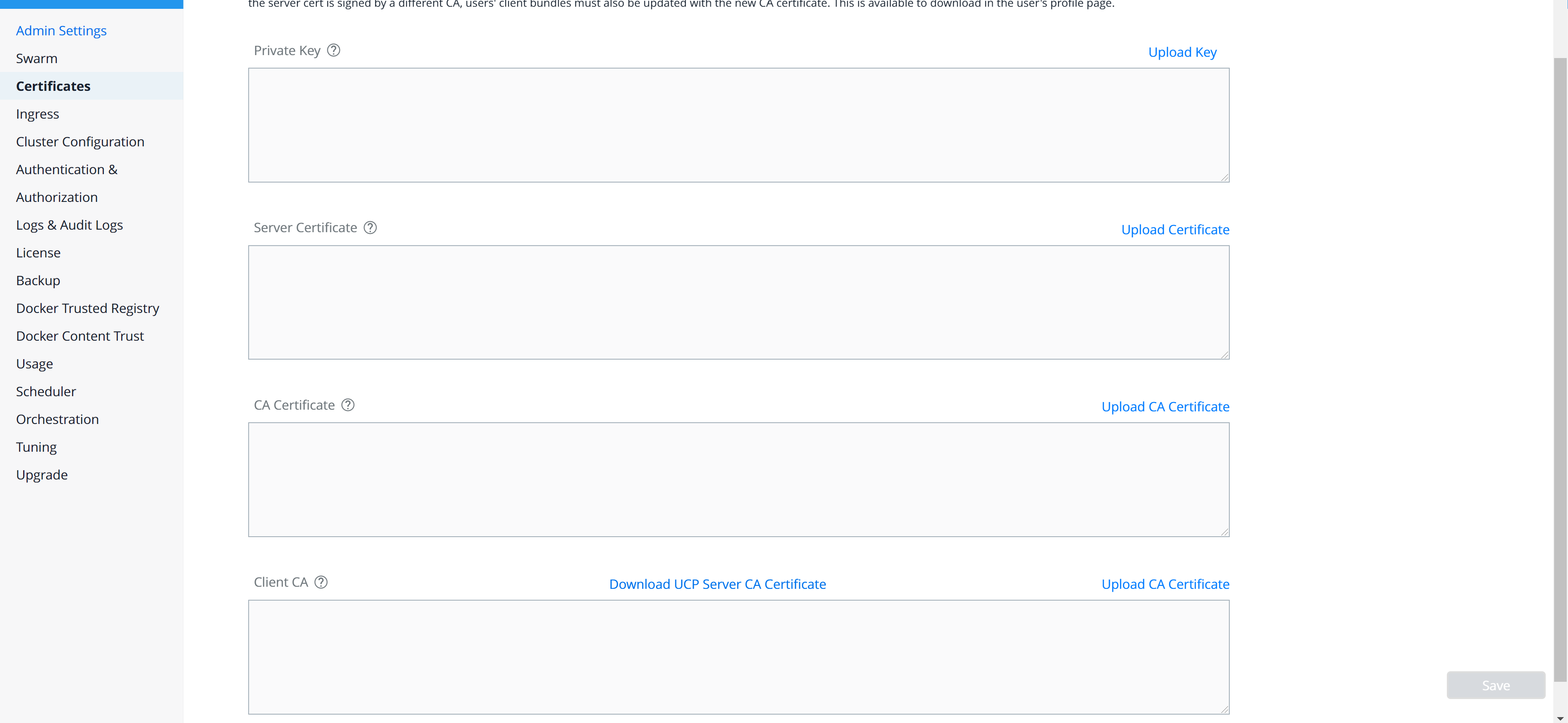 Type Description Private key The unencrypted private key of UCP. This key must correspond to the public key used in the server certificate. Click Upload Key. Server certificate The public key certificate of UCP followed by the certificates of any intermediate certificate authorities which establishes a chain of trust up to the root CA certificate. Click Upload Certificate to upload a PEM file. CA certificate The public key certificate of the root certificate authority that issued the UCP server certificate. If you don’t have one, use the top-most intermediate certificate instead. Click Upload CA Certificate to upload a PEM file. Client CA This field is available in UCP 3.2. This field may contain one or more Root CA certificates which the UCP Controller will use to verify that client certificates are issued by a trusted entity. UCP is automatically configured to trust its internal CAs which issue client certificates as part of generated client bundles, however, you may supply UCP with additional custom root CA certificates here so that UCP may trust client certificates issued by your corporate or trusted third-party certificate authorities. Note that your custom root certificates will be appended to UCP’s internal root CA certificates. Click Upload CA Certificate to upload a PEM file. Click Download UCP Server CA Certificate to download the certificate as a PEM file. -