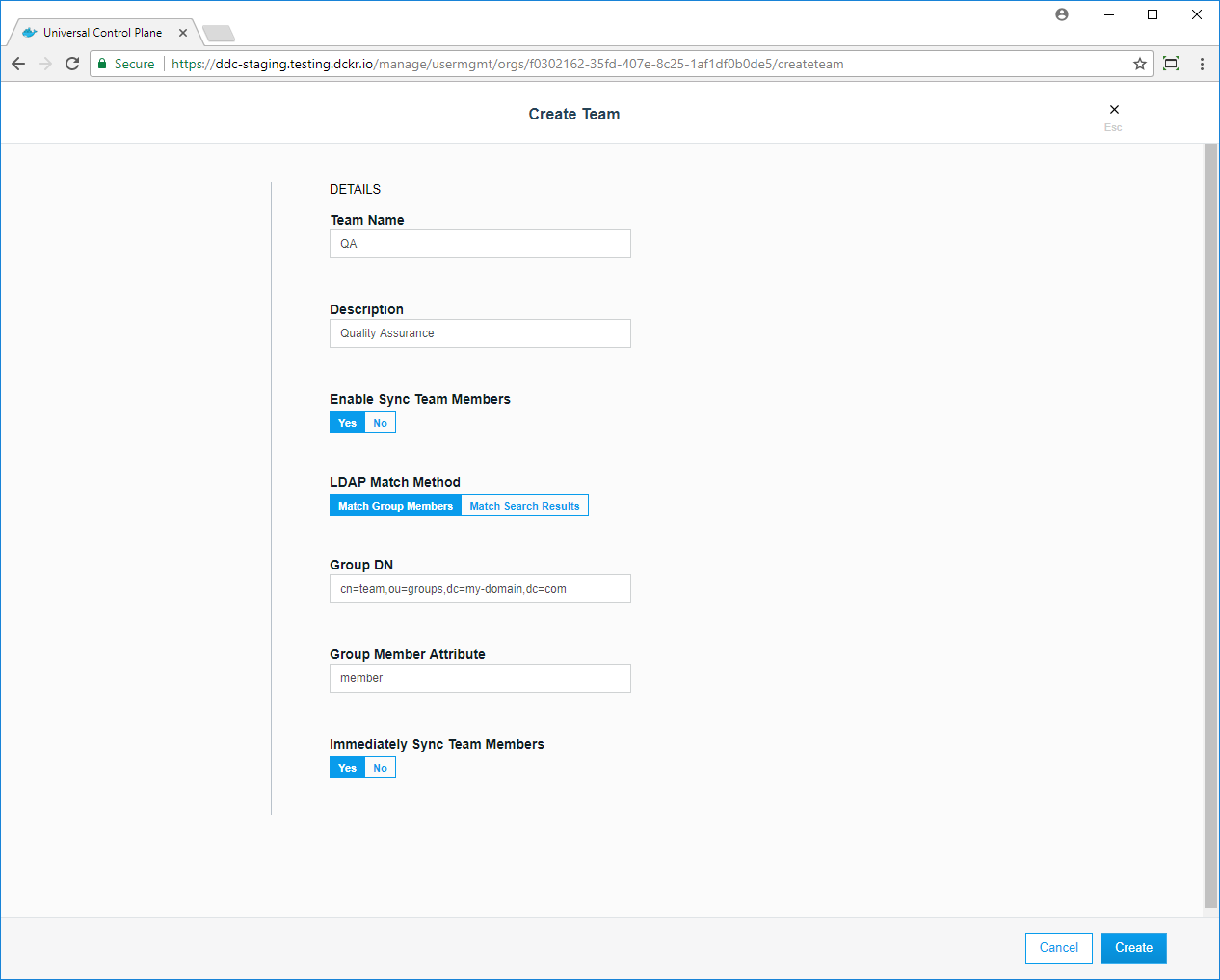 If Docker Enterprise is configured to sync users with a Lightweight Directory Access Protocol (LDAP) directory server, you can enable the syncing of new team members to occur either when creating a new team or when modifying settings of an existing team.