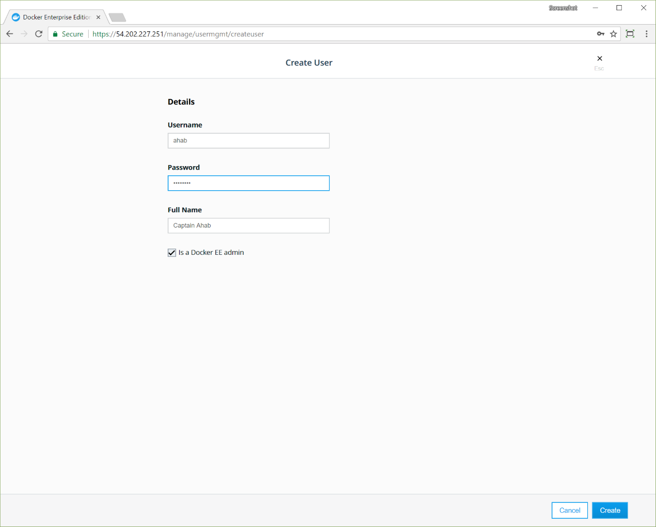 - Optionally, check “Is a Docker EE Admin” to give the user administrator privileges.
