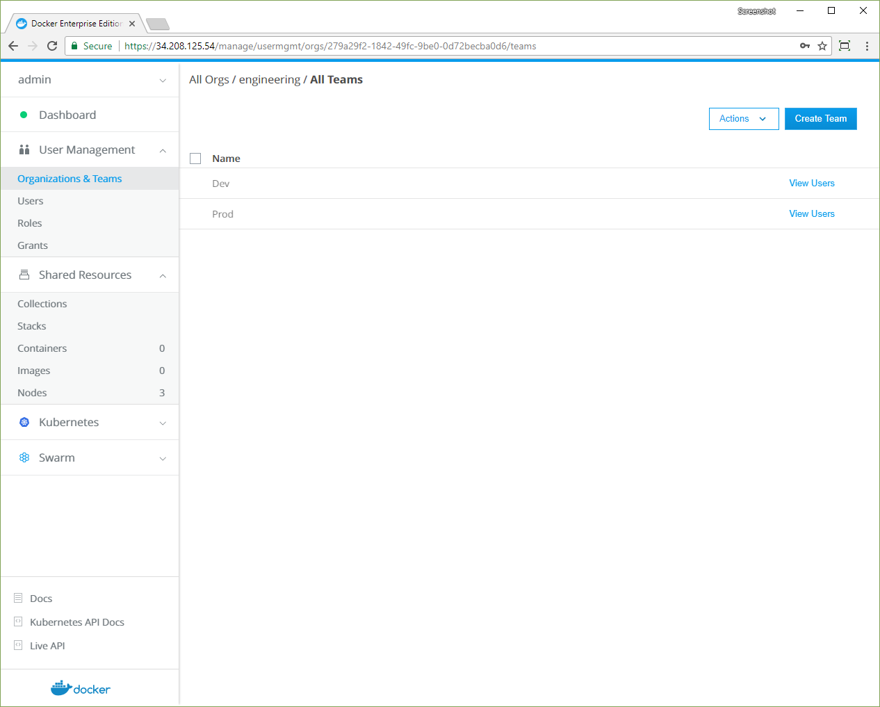Navigate to the Organizations & Teams page to create two teams in the “engineering” organization, named “Dev” and “Prod”. Add a user who’s not a UCP administrator to the Dev team, and add another non-admin user to the Prod team. Learn how to create and manage teams.