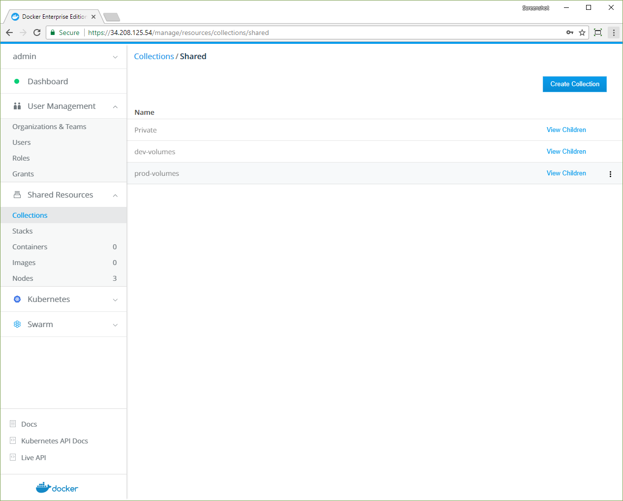 - In the left pane, click Collections. The default collection appears. At the top of the page, click Shared, find the dev-volumes collection in the list, and click Select Collection.