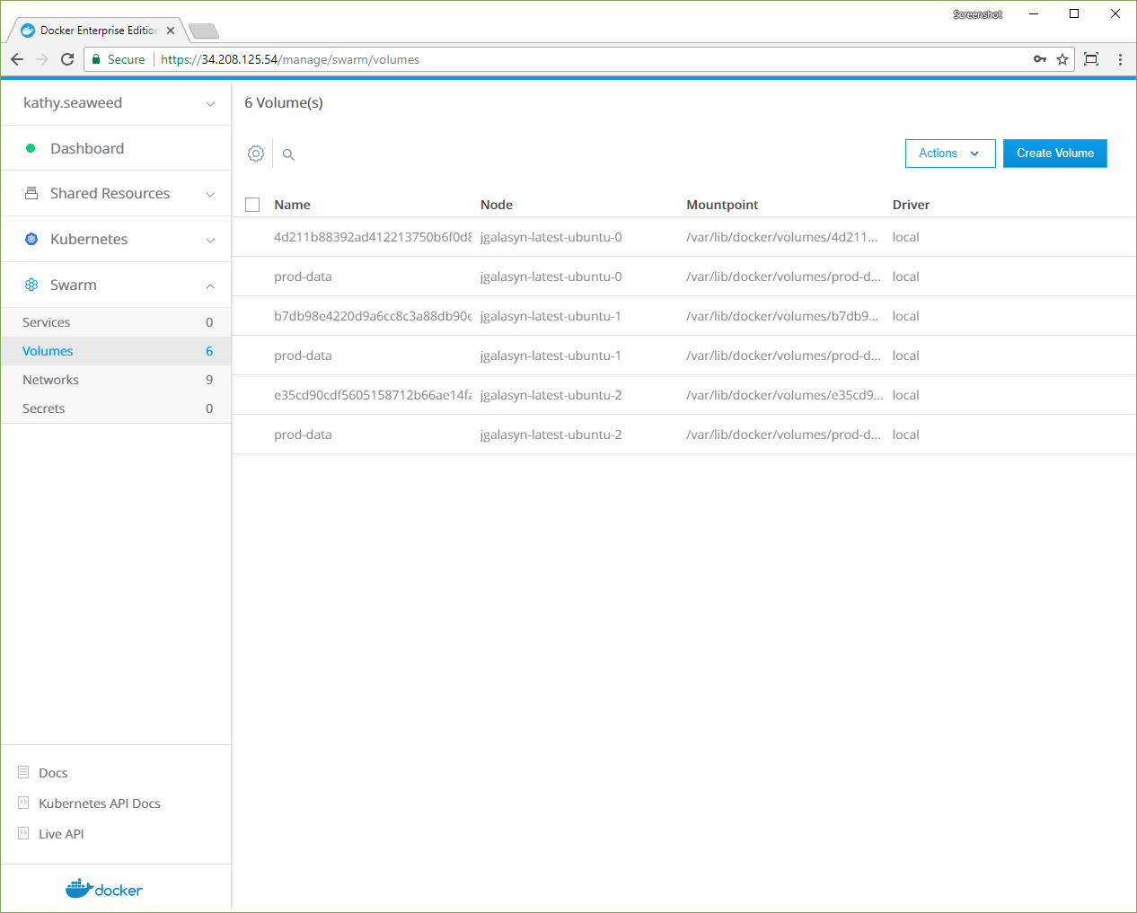 - Navigate to the Volumes page to view all of the volumes in the swarm that the user can access.