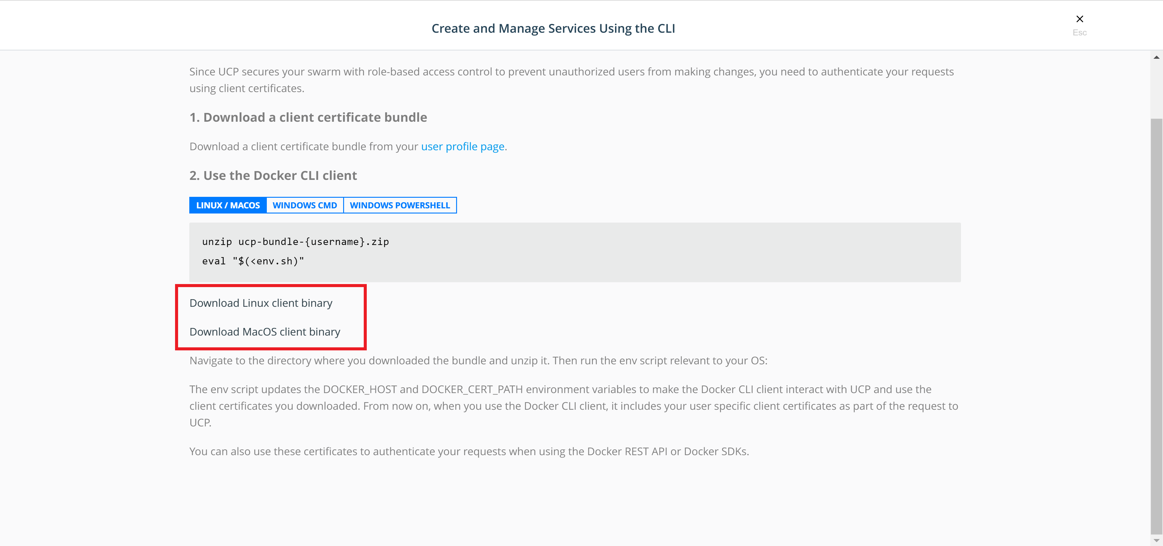 Download the Docker CLI client by using the UCP web UI. The web UI ensures that you have the right version of the CLI tools for the current version of UCP.